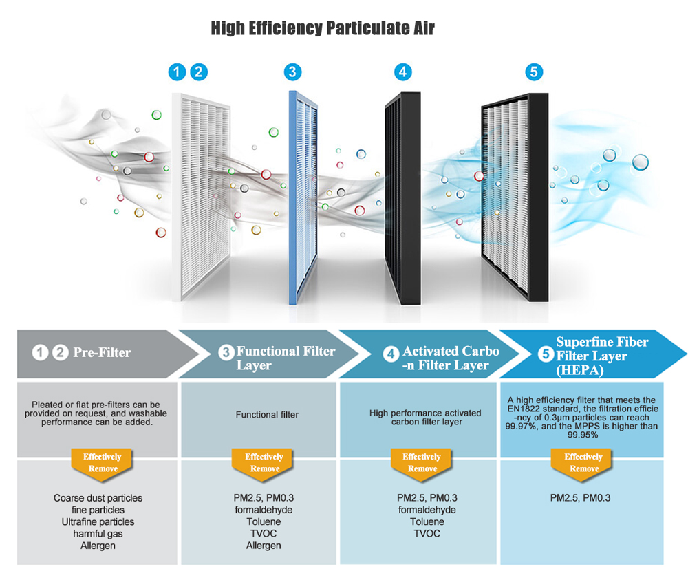 HEPA is the abbreviation of High Efficiency Particulate Air, which means “High Efficiency Particulate Air Filtration System”. The HEPA filter element has a very strong ability to filter particulate matter. It is the best of all filter element materials in terms of filtering PM2.5. The HEPA multi-effect air conditioner filter is based on the “activated carbon double-effect filter” with a medical-grade HEPA melt blown layer, which maximizes the filtration efficiency of the air conditioner filter without losing air flow technology. On this basis, an anti-mildew and antibacterial layer is specially added for the characteristics of air conditioning filters that are prone to mildew after long-term use. It has reached that the air conditioner filter can ensure that no bacteria will breed and produce peculiar smell under various use environments.